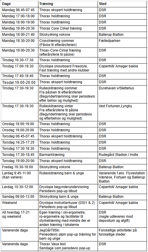Derfor bestræber Københavns Skiklub på at have mange træningsaktiviteter i København og omegn for vores medlemmer. Mange af disse tilbud vil være gratis, eller der opkræves et mindre gebyr for at dække eksterne omkostninger. Træning i DSR's lokaler (Danske Studenters Roklub), herunder vores holdtræning eller selvtræning på KS' Nordic Trainer (tidligere Thorax Trainer) kræver at man er tilmeldt holdet Thoraxtræning og har betalt et ekstra kontingent.